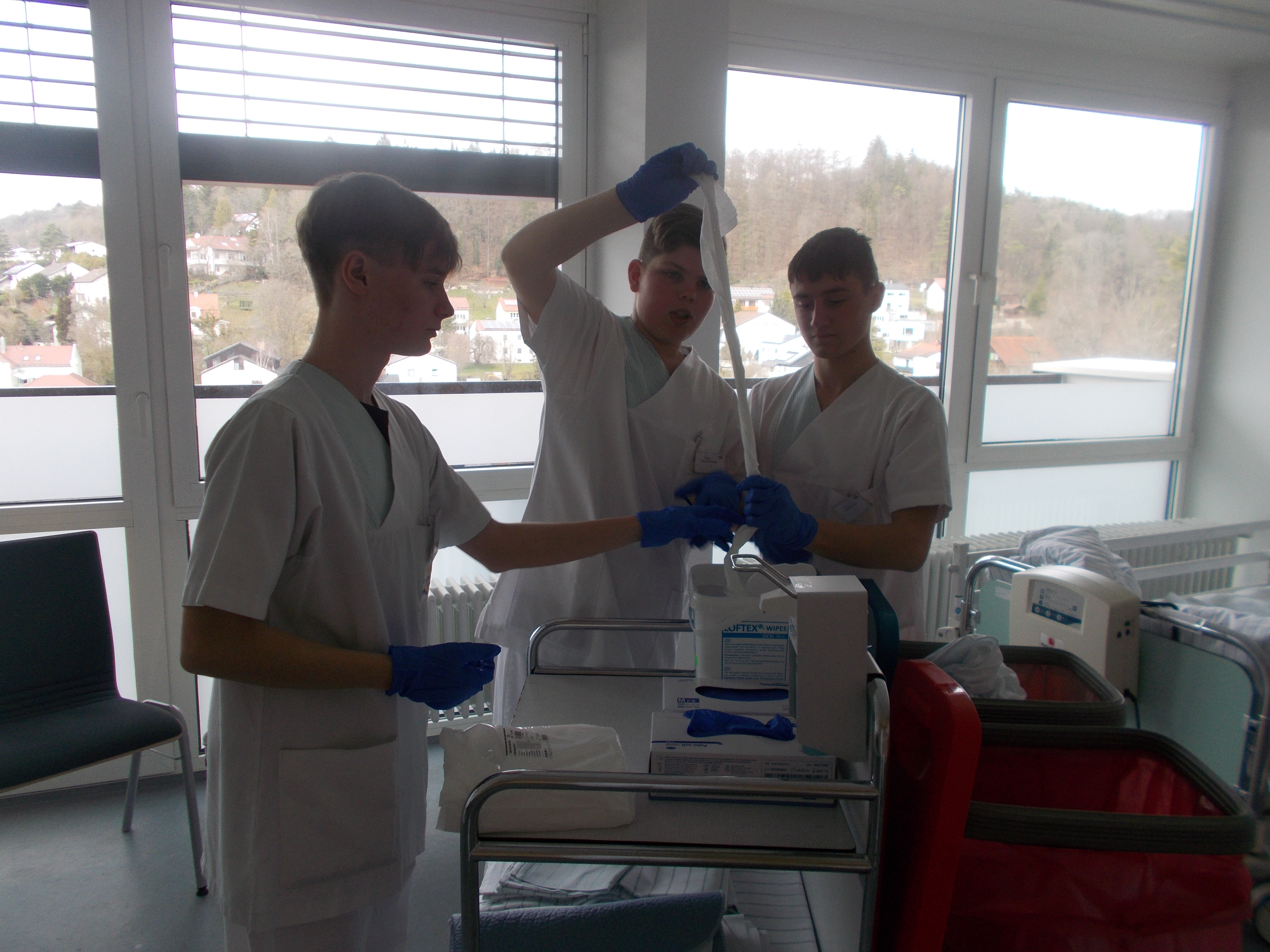 Um einen Überblick über die Abläufe in einer Klinik zu bekommen, gab es nach der Begrüßung zuerst eine Führung durch das Haus. Wie sehen die Stationen aus? Wo werden die medizinischen Instrumente aufbereitet? Was machen die Physiotherapie und das Labor?