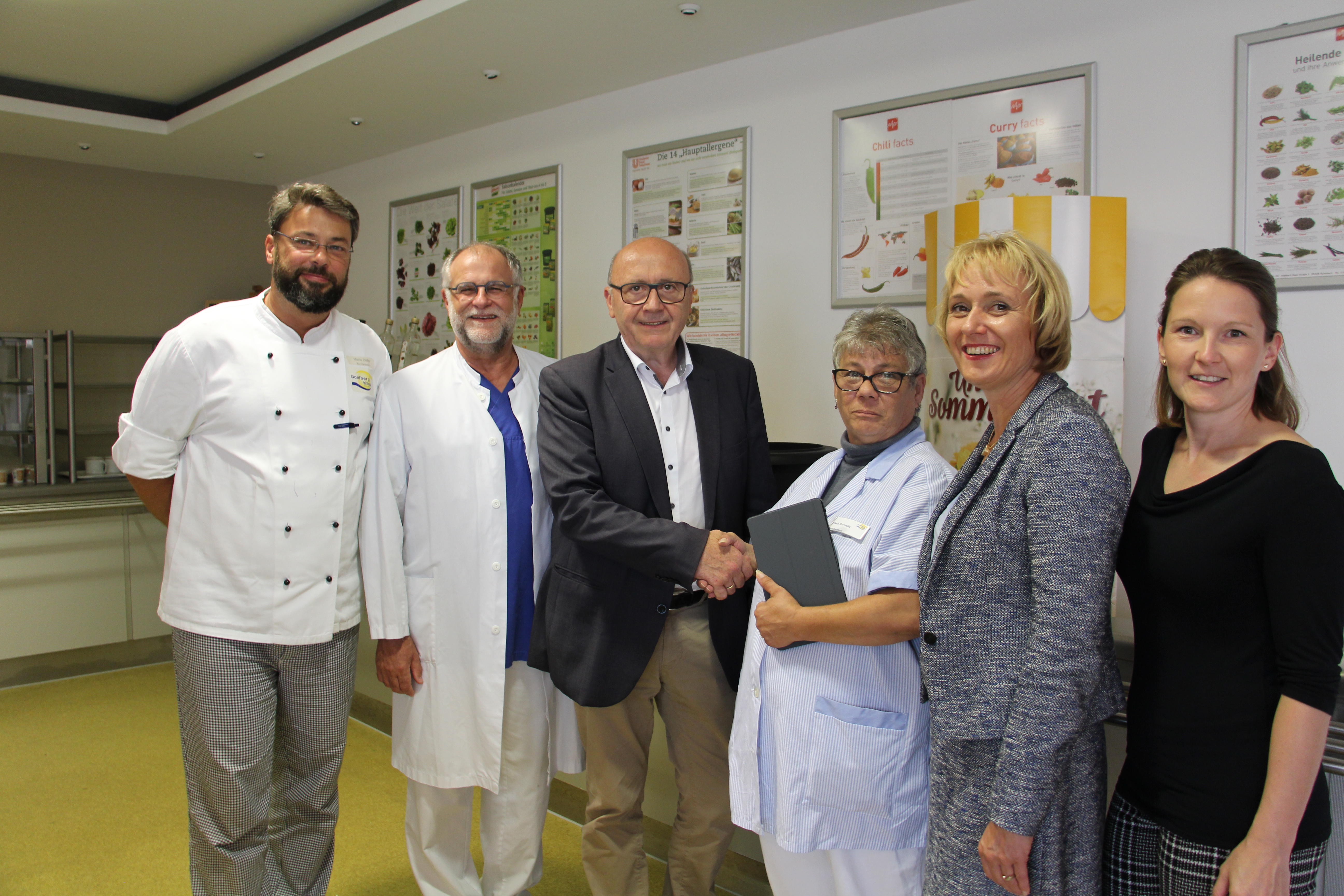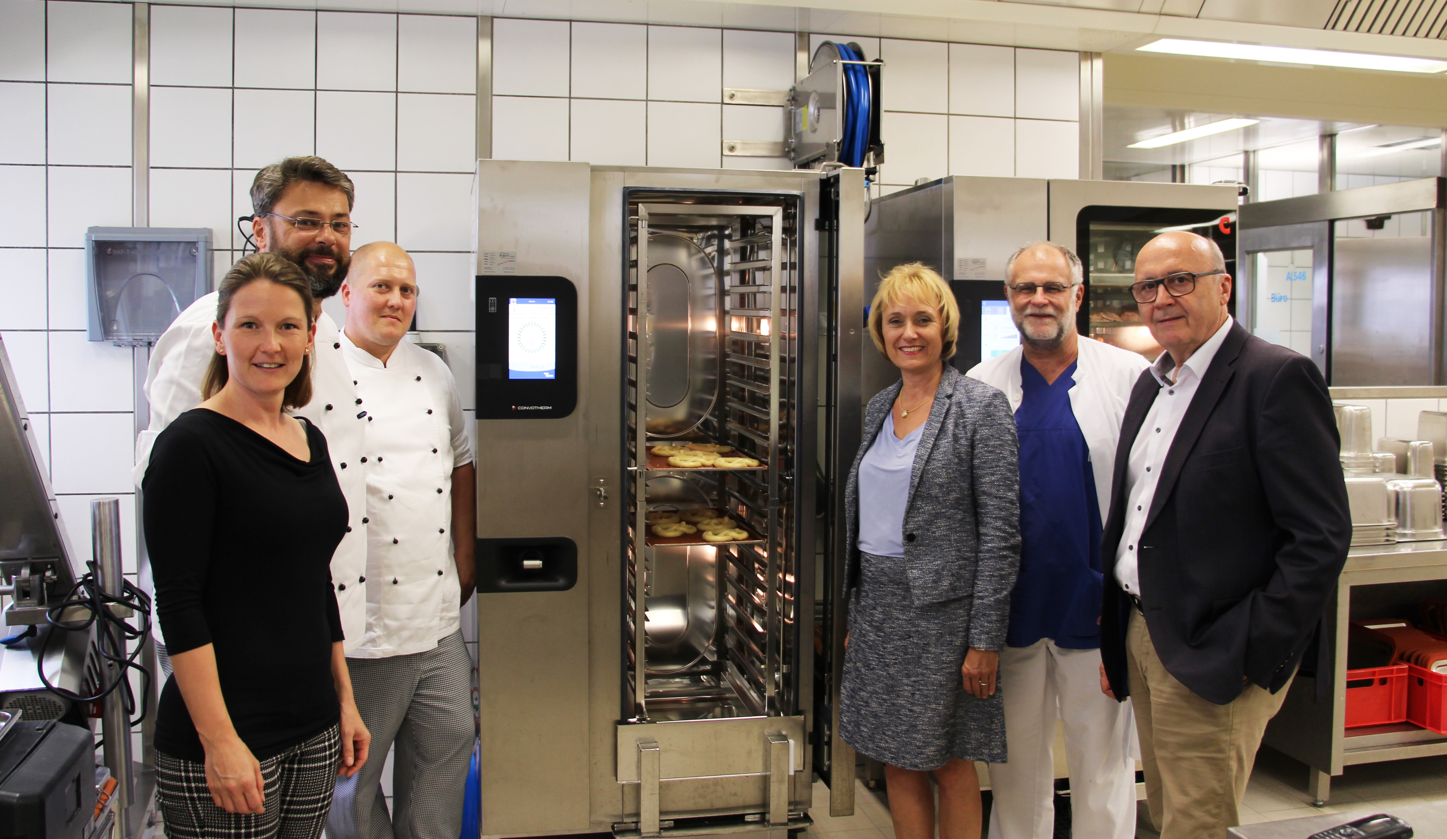 Kelheim, 31.07.2019. Die Küche der Goldberg-Klinik wird zukünftig die Patientinnen und Patienten noch besser kulinarisch versorgen können. Heute wurden die neuen Menüassistentinnen offiziell von Landrat und Aufsichtsratsvorsitzendem Martin Neumeyer und Geschäftsführerin Dagmar Reich begrüßt. Außerdem erläuterte Küchenleiter Mario Deller die Funktionsweise der neuen Kombiöfen der Küche.