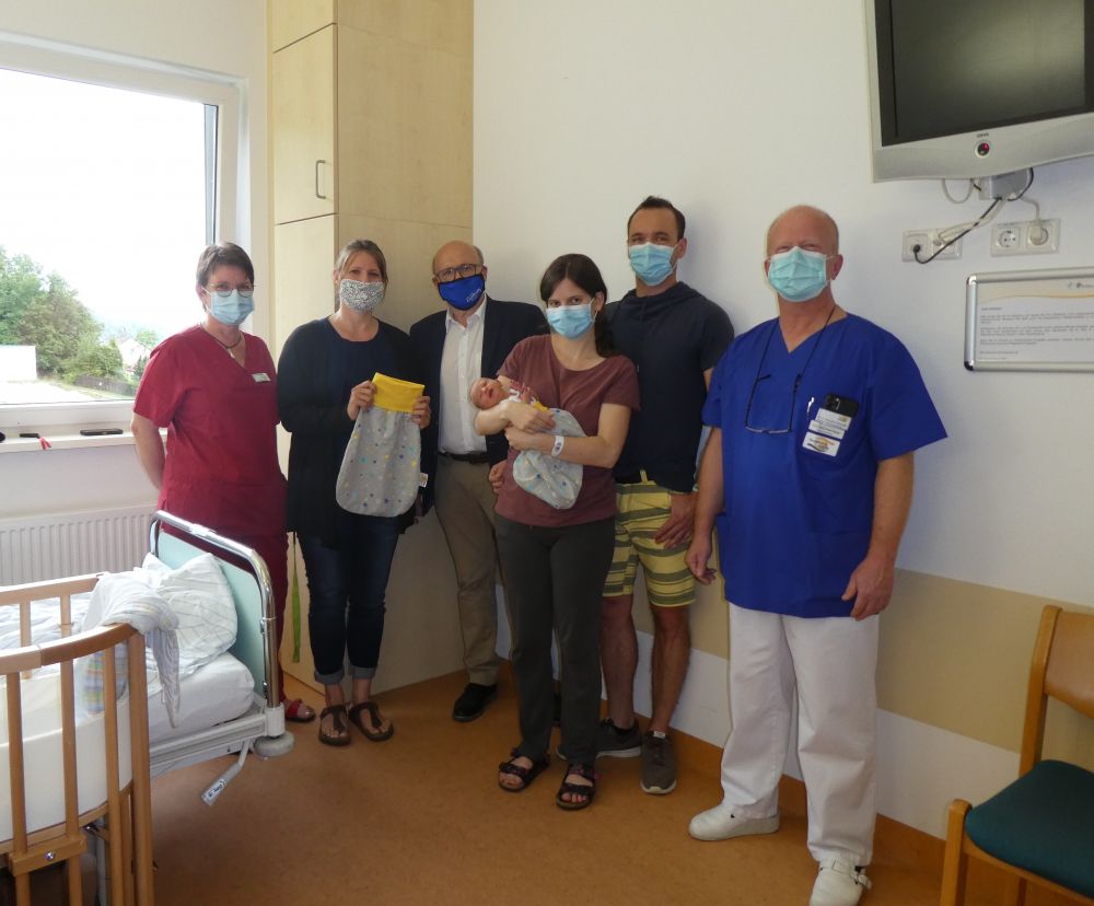 • Landrat und Aufsichtsratsvorsitzender Martin Neumeyer präsentiert Goldberg-Klinik-Pucksäcke für unsere Neugeborenen!