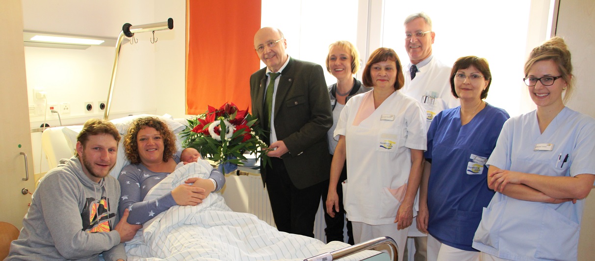 Das Jubiläumsbaby der Eltern Martina und Peter Hanus wurde am 23.12.2016 von Landrat Martin Neumeyer, Geschäftsführerin Dagmar Reich, Stv. Ärztlichen Direktor Chefarzt Dr. Joachim Berger, Oberärztin Blaga Lyubenova, Hebamme Theresa Offereins und Stationsleiterin Karolina Schöttl besucht. Sie gratulierten den Eltern und überreichten einen Blumenstrauß im Namen der Goldberg-Klinik. Der jungen Familie aus Kelheim wünscht das geburtshilfliche Team der Klinik alles Gute und viel Glück für die Zukunft.