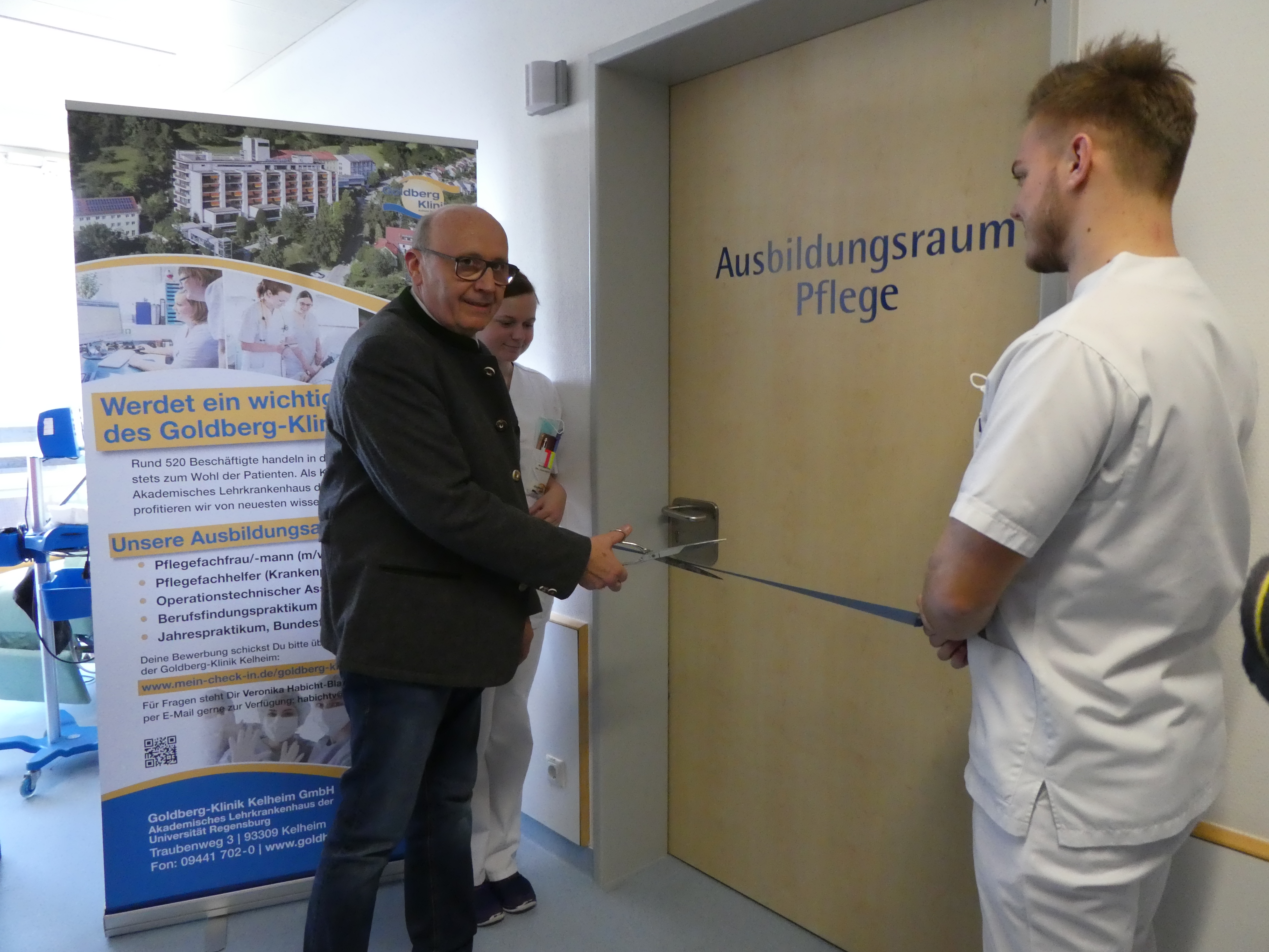 Landrat und Aufsichtsratsvorsitzender Martin Neumeyer eröffnet den neuen Ausbildungsraum für den Pflegenachwuchs an der Goldberg-Klinik