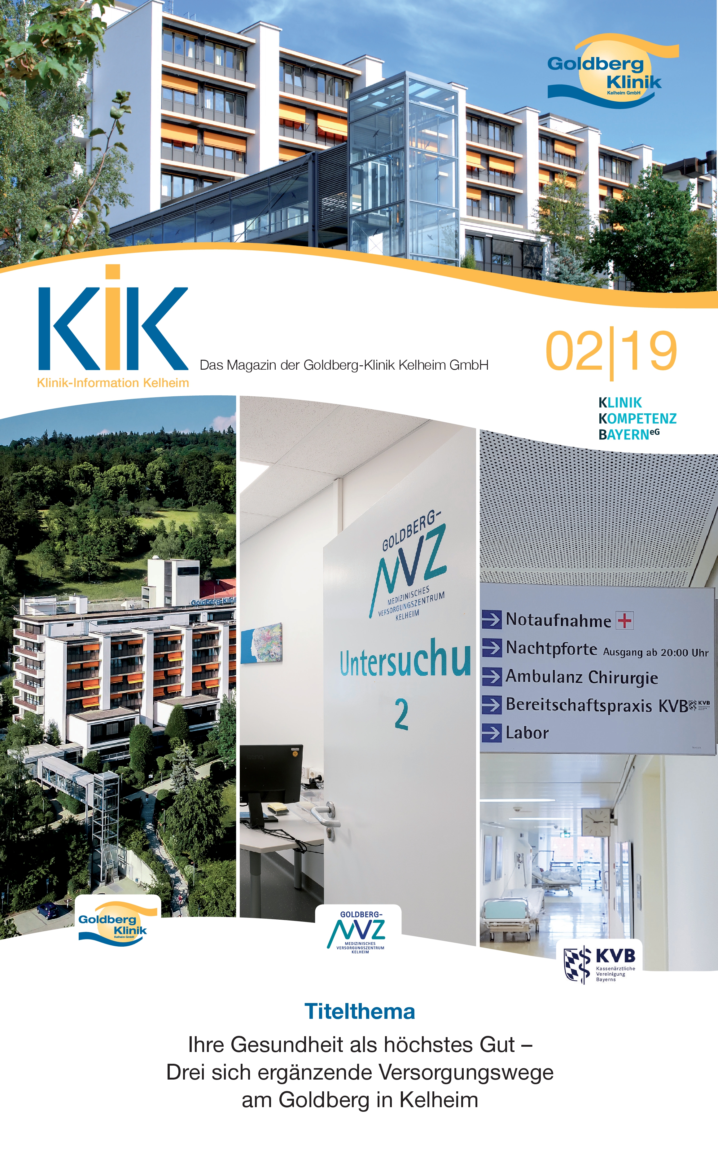 Kelheim, 23.12.2019. Wir freuen uns, Ihnen die Winterausgabe unseres Krankenhaus-Magazins KIK (Klink-Information Kelheim) vorstellen zu dürfen. Neben ihrer Funktion als Mitarbeiterzeitung richtet sich die KIK an Patienten, niedergelassene Ärzte, Besucher und Freunde der Goldberg-Klinik.